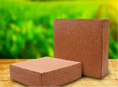 Compressed coco peat block made from coconut husk fiber, with excellent water retention and aeration properties.